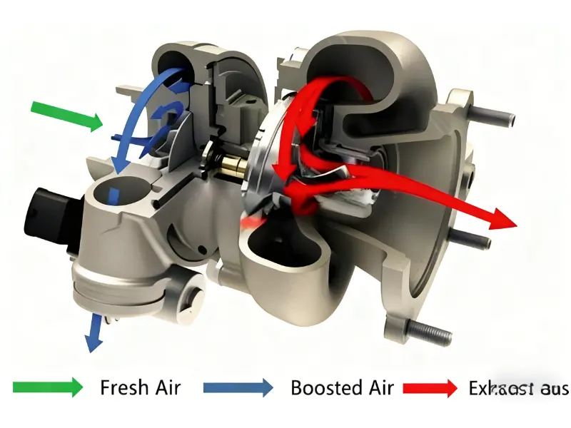 Turbokompresorius susideda iš dviejų pagrindinių dalių: turbinos ir kompresoriaus.